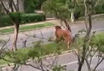 A ocorrência chamou atenção pelo contraste entre o ambiente urbano e a presença de um touro solto em uma área de trânsito intenso.
