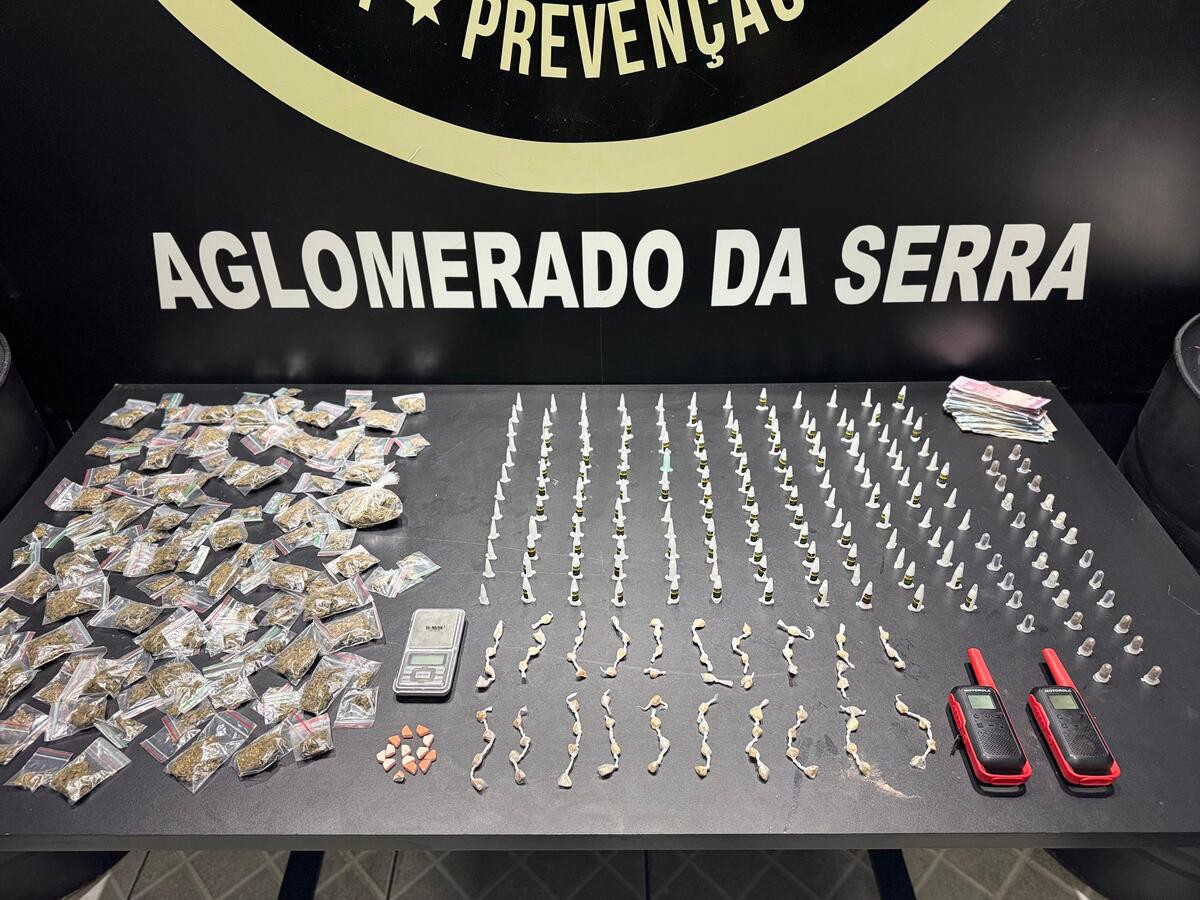 De acordo com a Polícia Militar, foram recolhidos 140 pinos de cocaína, 143 buchas de maconha, 29 porções de ice, 79 pedras de crack, 15 comprimidos de ecstasy, além de R$ 219 em dinheiro, uma balança de precisão e dois rádios comunicadores. O caso foi encaminhado à Polícia Civil para investigação.