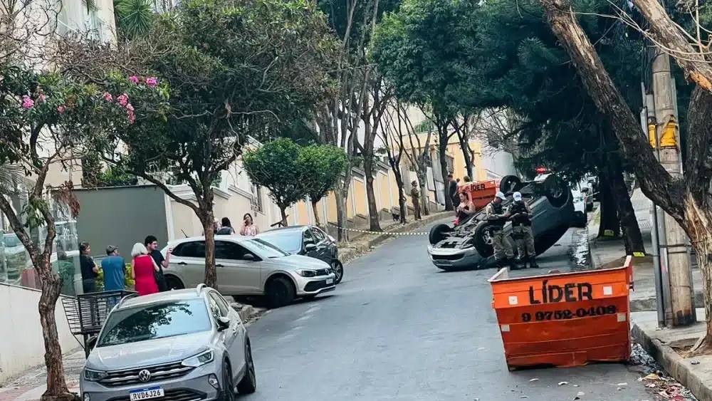 Um homem de 54 anos ficou ferido após o carro que dirigia colidir com dois outros veículos e capotar na Rua Professora Bartira Mourão, no bairro Buritis, na região Oeste de Belo Horizonte.